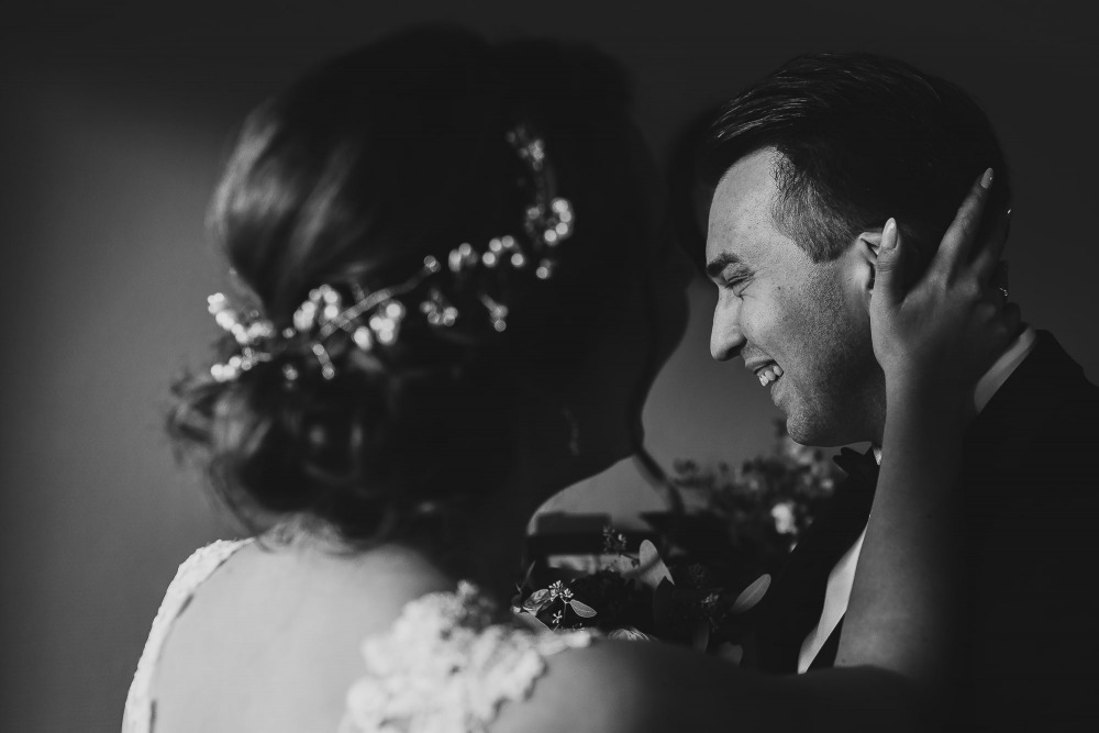 Tuż przed ślubem dopinamy ostatnie szczegóły. Wtedy też dopytuję, o ile nie ustaliliśmy tego wcześniej, czy Para chce mieć zdjęcia tzw. First Look. Są to zdjęcia z chwili, kiedy Pan Młody pierwszy raz widzi swoją ukochaną w sukni ślubnej w ich wyjątkowym dniu. Dbam, by takie kadry były wzruszające i nietuzinkowe, dlatego delikatnie podpowiadam, jak ułożyć rękę lub gdzie spojrzeć. Moje dyskretne wskazówki pomagają podkreślić na zdjęciach wyjątkowe piękno tej chwili, przez co fotografie ślubne są ciekawsze, ale nadal pełne prawdziwych emocji.