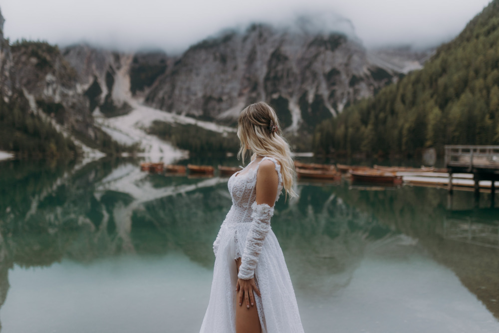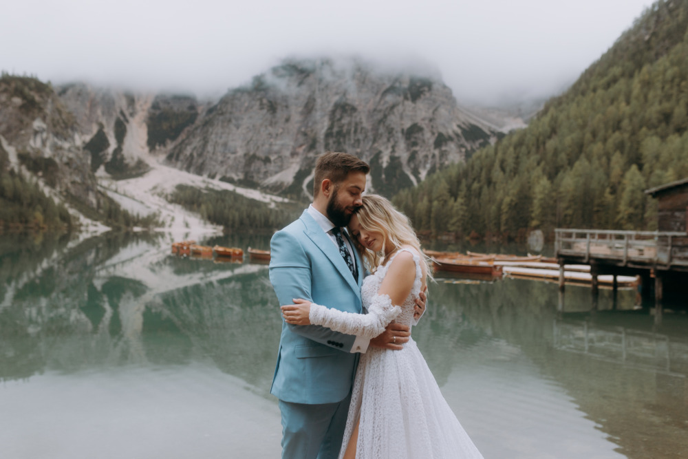 Mariusz odbierał nas w Niemczech i razem, przez Austrię, ruszyliśmy w kierunku Włoch. Kiedy wieczorem dotarliśmy na miejsce, wiedzieliśmy, że rano czeka nas coś wyjątkowego. Niestety jak to bywa często w górach, tym bardziej w jesiennych miesiącach, poranek przywitał nas mgłą i chmurami zakrywającymi majestatyczne szczyty Dolomitów. Jednak, gdy dojechaliśmy na miejsce, jezioro wyglądało jak z pocztówki – spokojne, tajemnicze i niezwykle fotogeniczne. Brak słońca podczas sesji zdjęciowych to wbrew pozorom nierzadko zaleta. Wtedy nie musimy walczyć z ostrymi cieniami na twarzach, a fotografowanie staje się łatwiejsze. Dzięki wczesnej godzinie udało nam się uniknąć tłumów i w pełni skupić na tworzeniu intymnych, pełnych emocji kadrów.